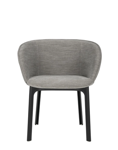Charla combines elegance with sustainability thanks to legs made from recycled plastic. The frame comes in black, with upholstery in bouclé fabric or a special mélange fabric for the contract market