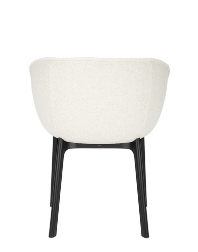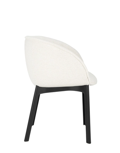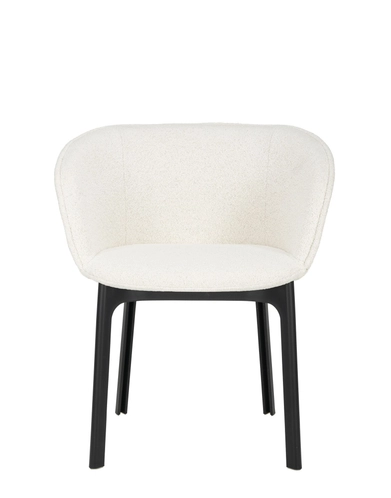 Charla combines elegance with sustainability thanks to legs made from recycled plastic. The frame comes in black, with upholstery in bouclé fabric or a special mélange fabric for the contract market