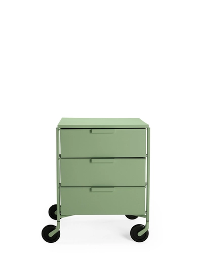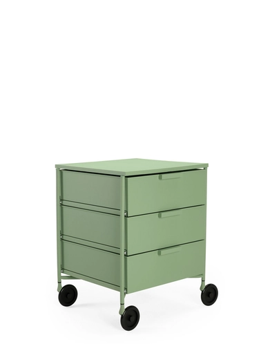 Winner of the Golden Compass in 1994, the Mobil chest of drawers is presented in a matt version in white, black, green, plum and light blue. The new edition is made of recycled industrial materials, and has the same robust construction and functionality as the original. The basic element of the system is the drawer, alternated with shelves and tops, connected by an aluminium structure.