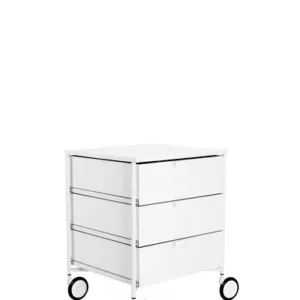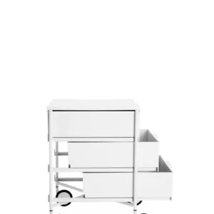 Winner of the Golden Compass in 1994, the Mobil chest of drawers is presented in a matt version in white, black, green, plum and light blue. The new edition is made of recycled industrial materials, and has the same robust construction and functionality as the original. The basic element of the system is the drawer, alternated with shelves and tops, connected by an aluminium structure.