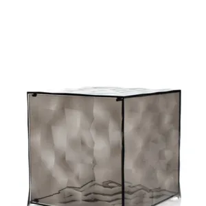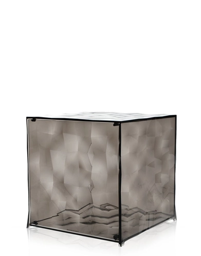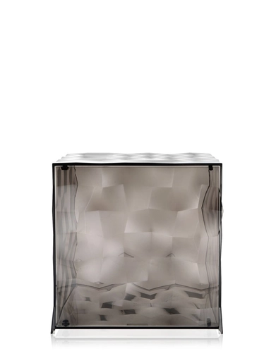 Optic is a container cube which comes in two versions: closed with a door or with one open side. Its surface is strikingly decorated with square based transparent or mirrored pyramids, slightly in relief, which create a strong visual impact. Optic measure
