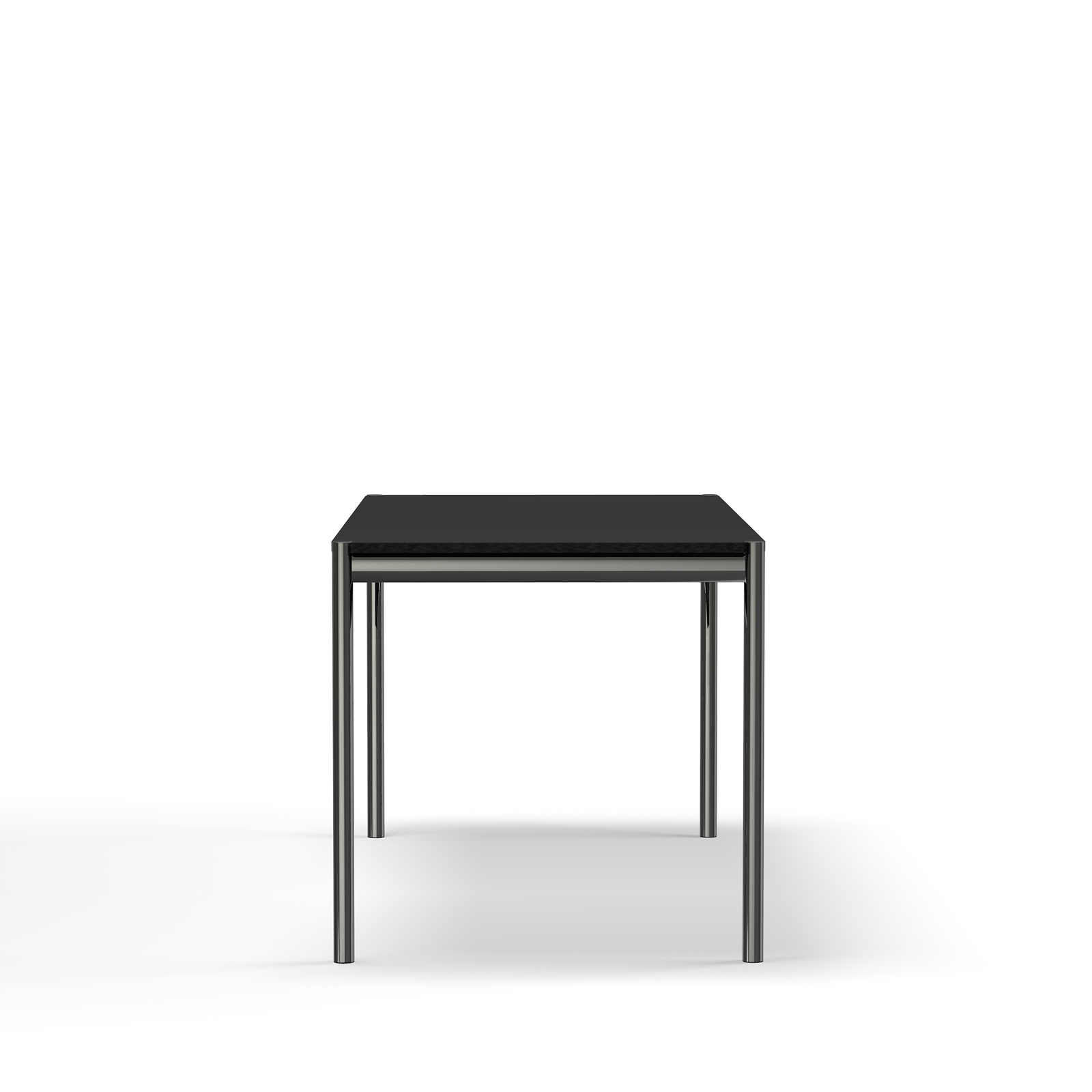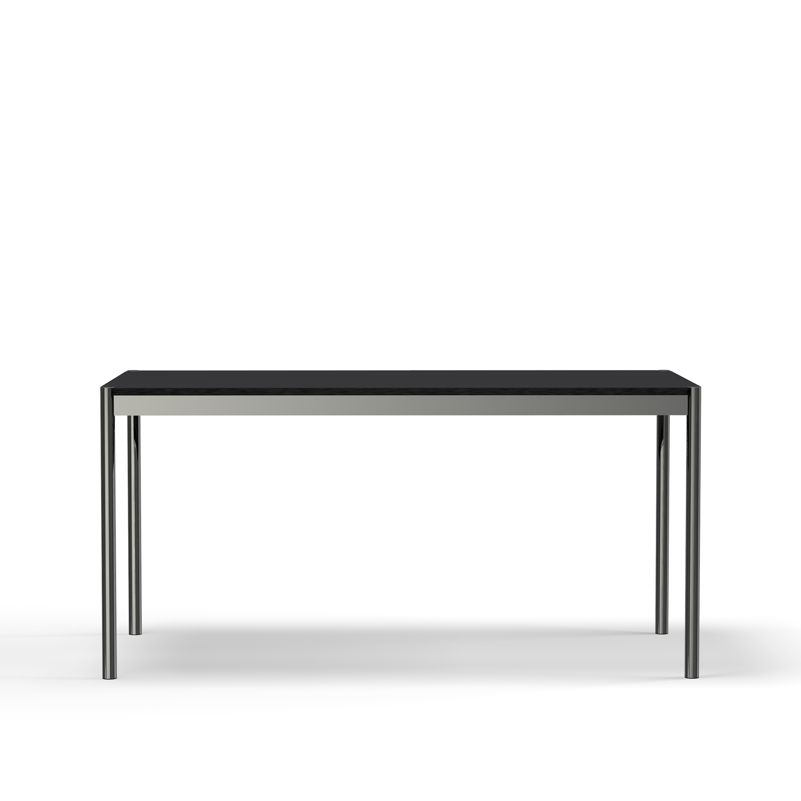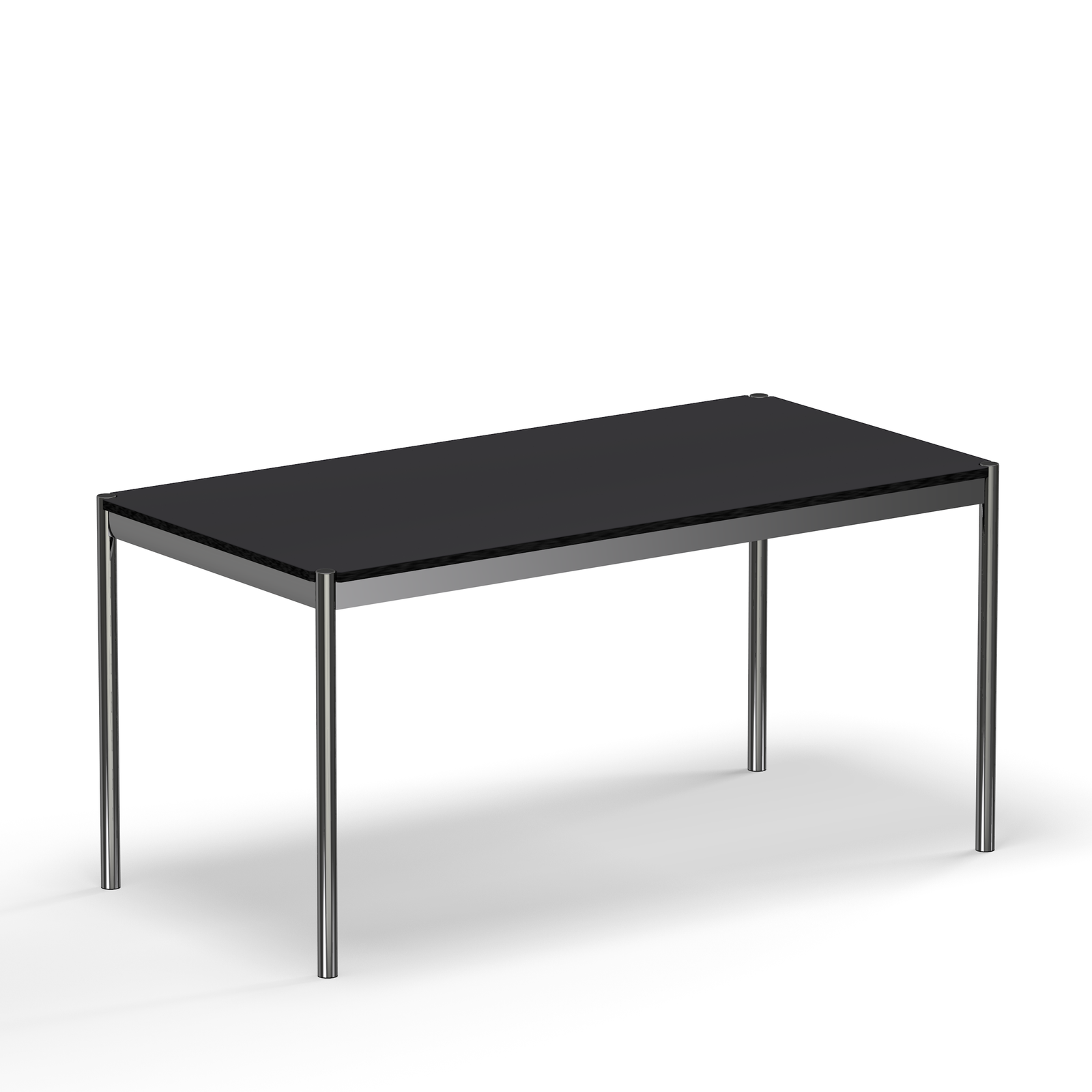 A modern office table with a chrome frame and table legs and a black linoleum top. Available in two sizes and two surface options for Quick Ship delivery.