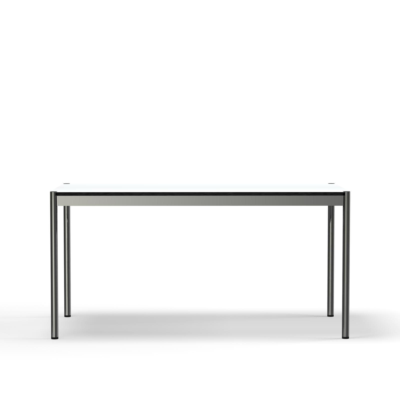 A modern office table with a chrome frame and table legs and durable pearl gray white laminate top. Available in two sizes and two surface options for Quick Ship.