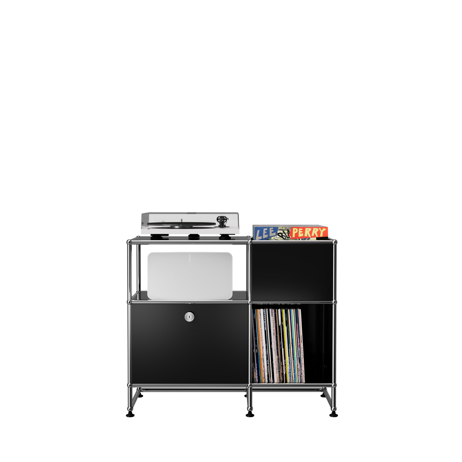 The USM x Symbol Record Stand is an incredibly efficient way to integrate an all-in-one vinyl listening station into your home. The expandable system can accommodate both casual listeners and hardcore audiophile collections. Flip bin allows for larger vinyl collections and casual browsing. The 35” Record Stand offers an all-in-one solution to store up to 255 records, audio components, and a turntable. Soft-close drop-down door.