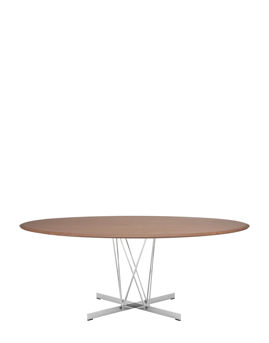 VISCOUNT OF WOOD tables are the latest addition. These naturally composed tables complement the collection’s choice of seats and create a sustainable living area in which wood plays a central role thanks to its lightweight properties. These large items of furniture feature top-quality materials and advanced manufacturing technology. The square and rectangular versions with four legs come in five sizes (100×100, 145×80, 160×90, 190×90 and 240×100) and three top finishes: light ash with two darker shades, flamed walnut and a third, characterised by thin strips of different tones of dark wood. The legs are in chrome or black.